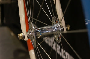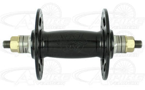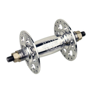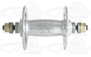 This Front Hub is part of the White Industries Track Hubset which is designed in a traditional vintage style with high flanges and window cut outs. Solid threaded axles are graced with bronze axle nuts to set off the beauty of these hubs