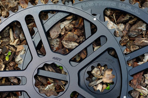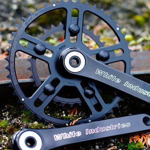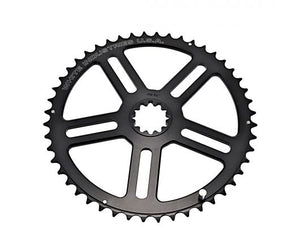 The outer ring is designed with a slotted section and the inner five bolt ring is self centering allowing more options when compared to traditional crank designs with set bolt circle requirements.